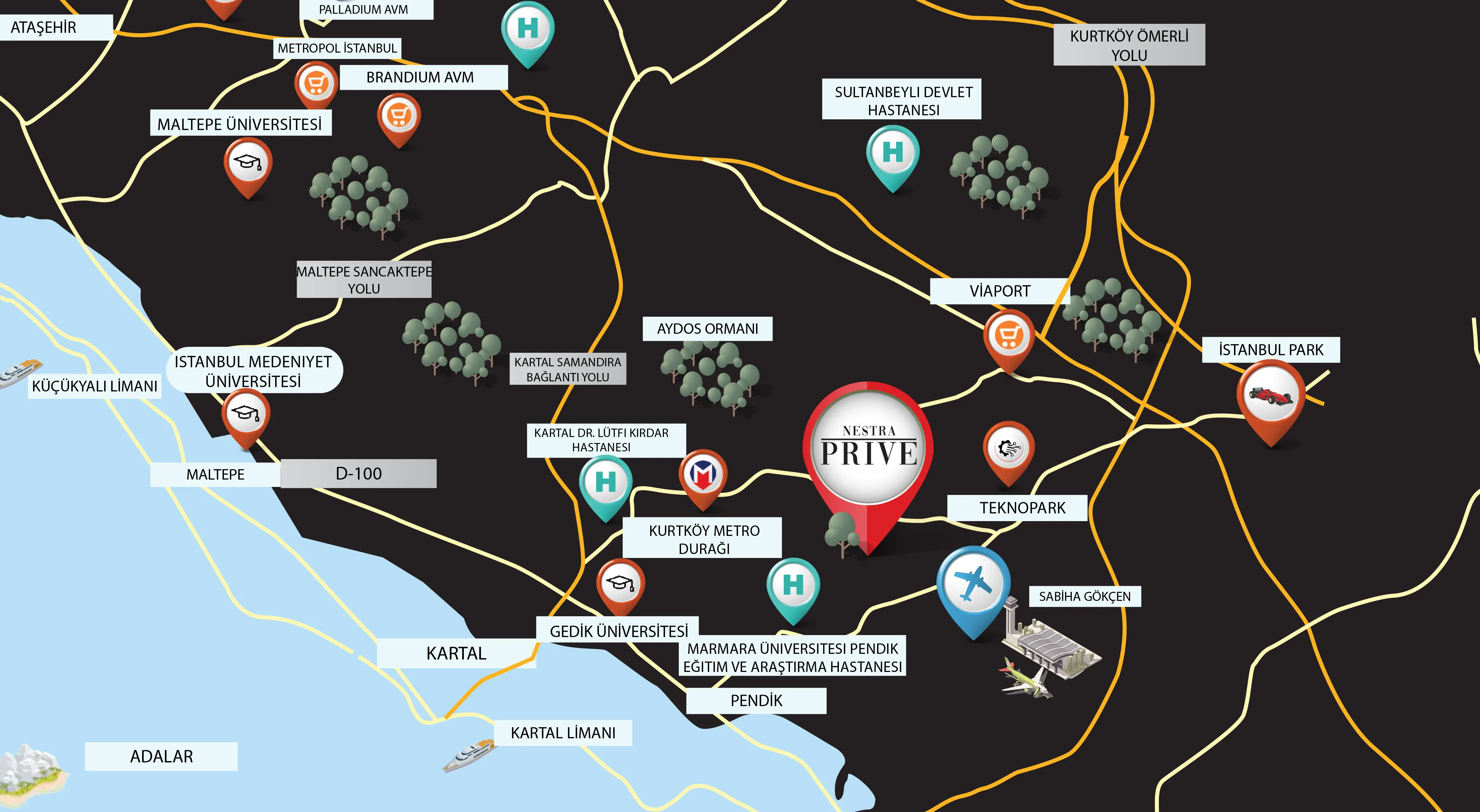 Sabiha Gökçen Havalimanı’na yalnızca 2 dakika mesafede, Bakü Caddesi üzerinde yükselen Nestra Prive; metroya 2 dakika, ViaPort AVM’ye 4 dakika uzaklığıyla hem iş hem sosyal yaşamda benzersiz bir konum ayrıcalığı sunuyor. Ayrıca Pendik Sahil ve Pendik Marina’ya 5 dakika, Tem Kuzey marmara otoyoluna 4 dakika uzaklıkta, özel hastaneler ise bir adım uzağınızda.